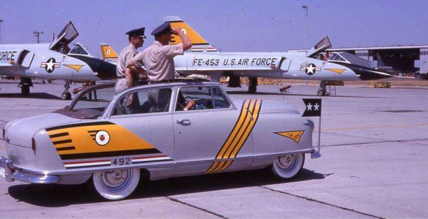 Another view of the Nash shows that its Landau top is rolled open with Lt. Col. Price (left) and MG Necrason (right) standing up in the back of the car. The duplicated markings of Lt. Col. Price’s F-106 are the same as the unit’s other F-106s with a few exceptions. The three stripes officially denote a squadron commander’s aircraft. The squadron’s emblem and markings on the rear fender include the last three digits of the serial number of Lt. Col. Price’s F-106. A placard on the right front fender bears the words “El Jefe”, Spanish for “chief” or “boss”.