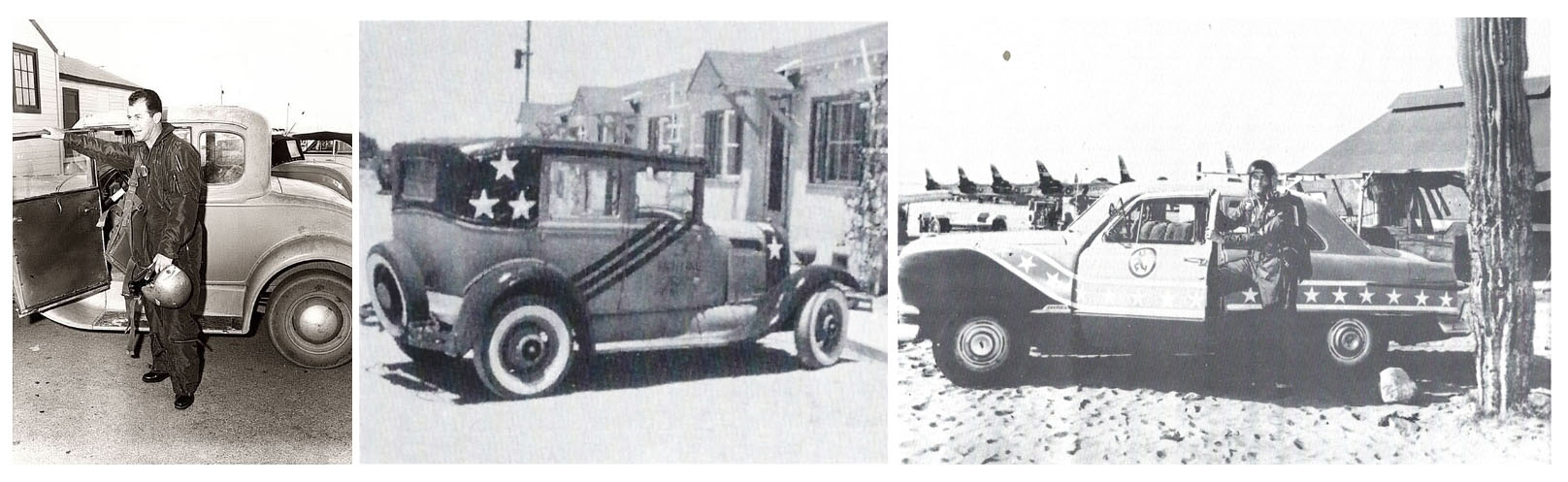 An example of Air Force fighter pilot’s interest in old cars is evidenced by wartime ace and test pilot Chuck Yeager at left. In 1952 he drove a Ford Model A while testing supersonic aircraft at Edwards AFB, CA. In the same year, a Ford Model A Tudor sedan in 75th FIS colors at Presque Isle AFB, ME has squadron commander stripes and whitewall tires just like the 456th FIS Rambler ten years later. At right, a 1950 Ford Custom sedan sports 37th FIS colors at Yuma AFB, AZ, where the unit was deployed from Ethan Allen AFB, VT in 1957. (Author)