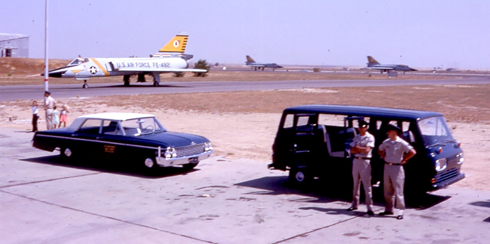 Two official Air Force vehicles stood by during the ceremony. Resplendent in Air Force Blue with white top at left is a 1963 Ford Galaxie 500, possibly MG Necrason’s staff car, and a Ford E-100 Econoline van. In the background, F-106A serial number 57-2482 leads the other 456th FIS aircraft on their return after the ceremonial flyby. Its two stripes denote its assignment to the 456th FIS Director of Operations.