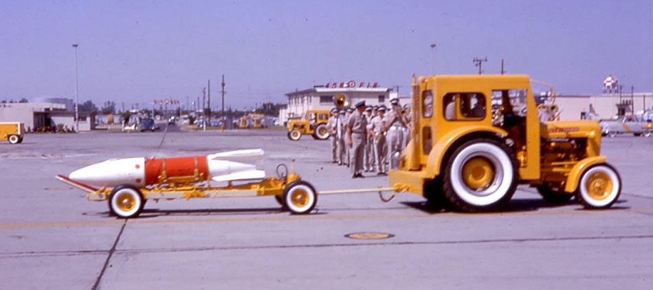 The 456th went a step further in the ceremony by also including usually unseen ground support vehicles on parade that were uncommonly well-trimmed for the event. The image above depicts a whitewall-equipped Ford 621 Tug towing an MF-9 Transport Trailer, also sporting whitewall tires, upon which an AIR-2A “Genie” air-to-air rocket is resting. The Genie was built by Douglas Aircraft (later merged with McDonnell Douglas and now absorbed into Boeing), became operational in late 1957, and after production ended in 1962 it remained in service until 1985. The Genie was unique in that it was the first nuclear-tipped missile in the world that was designed for use against aircraft. It was developed as a last-ditch weapon in the event that defending interceptor aircraft were vastly outnumbered by an attacking force. After expending conventional Hughes AIM-4F Falcon and AIM-4G Super Falcon missiles against individual aircraft, firing the Genie into an enemy formation and detonation of its 1-kiloton warhead (equivalent to 1,000 tons of TNT, enough to obliterate a city block) could destroy several aircraft at once. The thought was that since the attackers would be carrying atomic weapons, any fallout from a Genie nuclear burst would be preferable to having even one enemy bomber unleash its far more destructive payload.