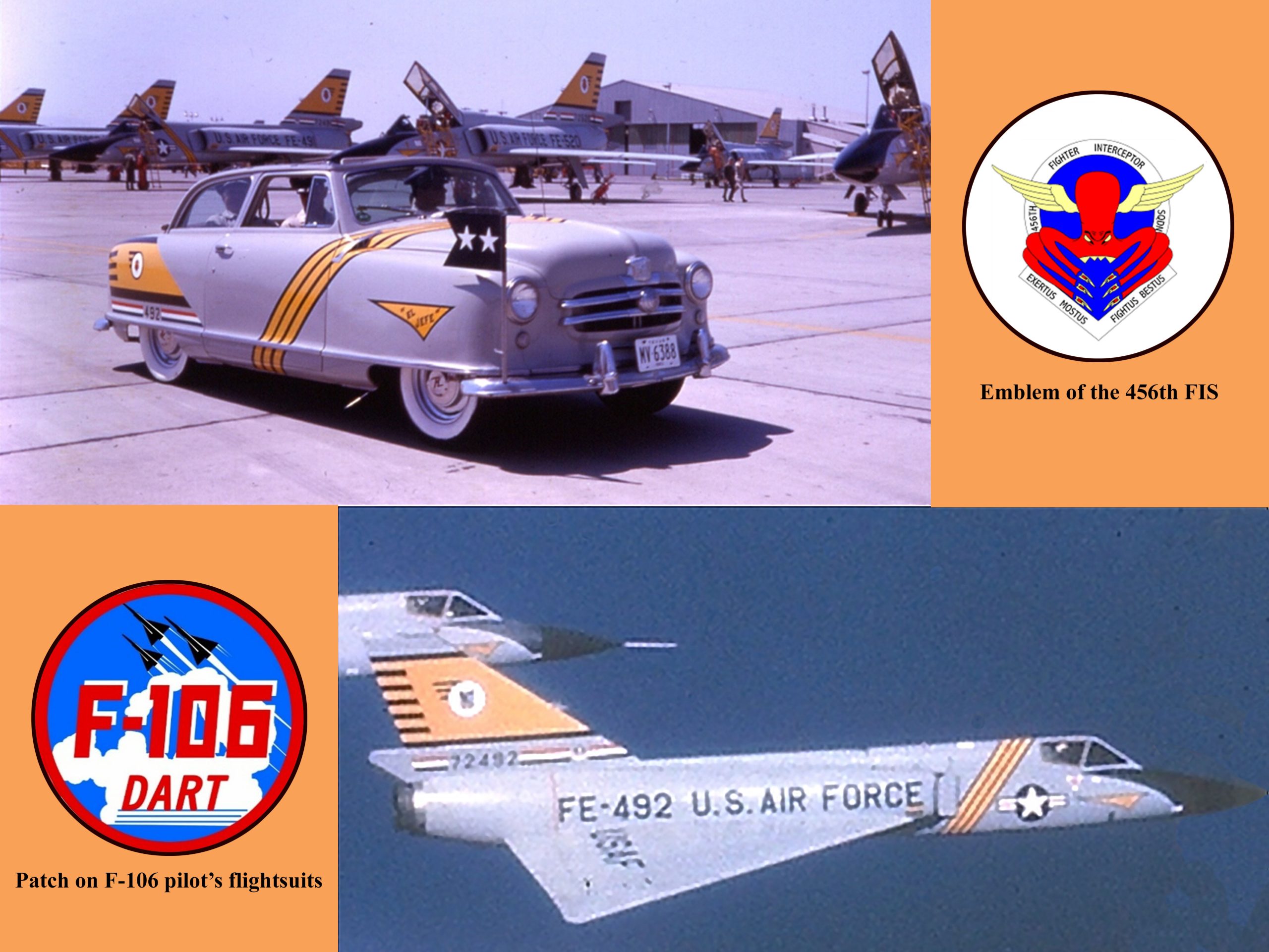 Lt. Col. Price’s Nash Rambler convertible (top) carries the same markings as his F-106 aircraft (above). Per protocol, the flag on the front right bumper denotes that a 2-star general officer is aboard. At the time, Major General (MG) Conrad F. Necrason was commander of the 28th Air Division at Hamilton Air Force Base near San Francisco. The 456th FIS was a component unit of the 28th. It therefore seems likely that the flag is for MG Necrason, making the Nash an interesting platform from which to review the 456th’s personnel and facilities.