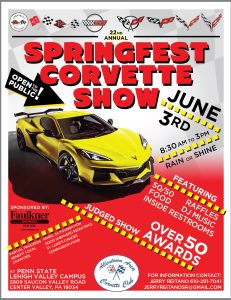 Classes include street stock, modified and custom, as well as best-of-show and sponsor’s awards. Our live DJ, 50/50 drawing, and raffles will add lots of energy to the show and our food vendors will have something for everyone. We are back at the Penn State Campus (Saucon Valley) which is a terrific location for showing cars…lots of pavement and plenty of room! The location is right across from the Promenade Shops at Saucon Valley where you will find fine dining and shopping. All registration is by mail. Please visit our website (www.allentowncorvetteclub.org) for a full view of the flyer for the event and more information. Hope to see you there!