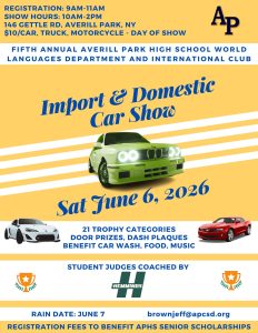 The 5th annual Averill Park High School World Languages Department and International Club’s Import &Domestic Car Show will take place on Saturday June 6, 2026 at Averill Park High School (146 Gettle Road, Averill Park, NY 12018). Registration ($10 day of show) is from 9:00am until 11:00am and the show continues until 2:00. Our volunteer student judges (coached by Hemmings Motor News professionals) will be selecting the winning vehicles in 22different trophy categories. Imported and domestic cars, motorcycles, and trucks are all welcome. Registration proceeds will benefit senior scholarships for the World Languages Department. Food sale proceeds will benefit the International Club. The rain date is June 7.