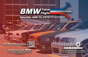 MARK YOUR CALENDARS BMW TakesFlight at Lyon Air Museum RETURNS on Saturday, June 14th, 2025 as a celebrationof precision engineering and the artistry of automotive performance with abackdrop of historic aircraft all on our Flightline