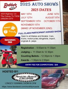 Participant judged, with 26class’s, 4 Best of Show, Bubba’s pick and Peoples pick. Sharethis with family and friends! Monthly Muscle Car Shows invites you, yourfriends and neighbors to come out to have lunch and see all the cars andtrucks! ALL cars, trucks, (Pleasetell all friends with Jeeps/4×4, andmotorcycles/slingshots) are welcome! WE only take payment in person, never online or on FB, doNOT pay anyone else than Monthly Muscle and only at the show!