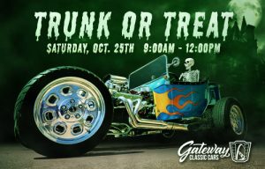 A spooktacular morning for ghouls and goblins to roam Gateway Classic Cars – Trunk or Treat Caffeine and Chrome Car Show. Bring your decked out classic for all the littles ones to admire from 9am to 12pm. Enjoy pastries and coffee (while supplies last). Free and open to the public!