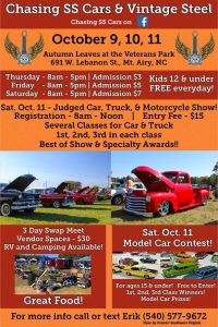 Chasing SS Cars Autumn Leaves 3 Day Swap Meet And Saturday Judged Car Show. Large 3 Day Automotive Swap Meet, Vendors From All Over The East Coast Selling New And Used Automotive Parts, Classic Cars, Tools And Garage Needs, Vintage Signs And Gas Collectibles, Antiques, RV Camping, Great Food, Live Music,