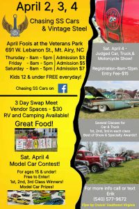 Chasing SS Cars April Fool’s True Automotive Swap Meet and Saturday Judged Car Show, one of the largest True Automotive Event, 3 Day Show, Vendors From All Over The East Coast Selling New and Used Automotive Parts and Accessories,Tools and Garage Supplies, Vintage Signs and Gasoline Related Products, Antiques, Camping, Great Food, Live Music.