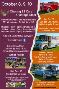 50th Year Chasing SS Cars Autumn Leaves Swap Meet and Saturday Judged Car Show, Large Automotive Swap Meet, New And Used Automotive Parts and Accessories, Tools and Garage Needs, Vintage Signs and Gas Related Accessories, Antiques, RV Camping, Great Food, Live Music, This Is A Huge Automotive Gathering.