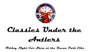 >>> Classics Under the Antlers – Friday Night Car Show at the Buena Park Elks. First Friday of the month from 4:00pm-7:00pm. Lonnie’s Grill will be open from 5:00-6:30pm. Hamburgers, Hot Dogs, Inside Dinners when available. Drinks, desserts. Opportunity Drawings / Trophies.