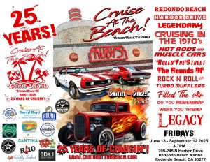 “Cruise At The Beach!” Redondo Beach’s Legacy Car Show returns for a 25 Year Celebration and it’s 24th Season Fridays June, 13 – Sept. 12, 2024. 3-7pm