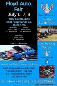 Floyd Auto Fair Judged Car Show, Huge 3Day Swap Meet, Vendors For All Over The East Coast Selling Automotive New and Used Parts, Tools and Garage Needs, Vintage Signs and Gas Related Merchandise, Antiques, And Other Cool Vintage Stuff, Car Show Saturday 8th Must Be Registered By 12 Noon. Camping Live Music, Great Food. More info call Erik 540-577-9672 or Chasing SS Cars on Facebook