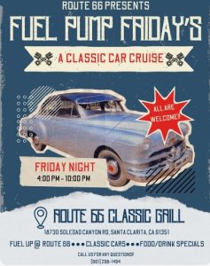 >>>Fuel Pump Fridays – A Classic Car Cruise. At the Route 66 Classic Grill, every Friday night 4:00pm-10:00pm