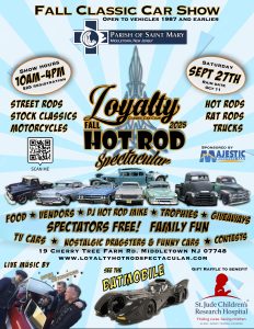 Get ready for the 2025 Loyalty Fall Hot Rod Spectacular! Open to cars from 1987 and earlier. Bring your American and Foreign Hot Rods, Muscle Cars, Rat Rods, Stock Classics, Trucks, Motorcycles…. even Race Cars! Get up and close in the specialty car corral and watch as we fire up the 2000 horsepower Nostalgic Nitro Dragsters Freaky Tiki and the Blue Mountain Express II. Check out the Batmobile and other tv cars. Kids, get a picture with the Monster Mud Truck “Bad Intentions”. Get down all day with live music by Dibbs and the Detonators, backed up by DJ Hot Rod Mike. Vendors, Food trucks, Door prizes. First registered 200 cars receive goody bags. Gift auction to benefit St. Jude Children’s Hospitals. FREE entry and parking for spectators, only $25 for registered cars. Trailer parking available (email in advance). 45 awesome trophies. Mark your calendars, September 27th (Rain date Oct 11th). Be There!!
