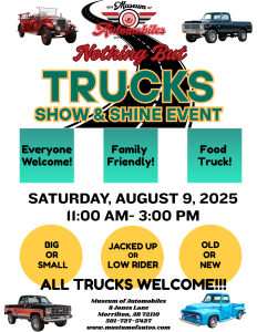 Show & Shine for trucks held at the Museum of Automobiles on top of Petit Jean Mountain. Saturday, August 9, 2025 from 11:00am-3:00pm. Food truck, family friendly, 50/50 raffle. All trucks are welcome! Bring the family and a lawn chair and spend the day with us!