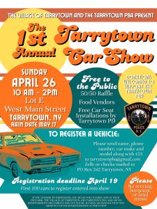 Village of Tarrytown 1st Annual Car Show hosted in Lot E. Free to the public. $25.00 Car Registration. Fun for the whole family! 50/50 Raffle.Food Trucks. Free Child Car Seat Installation will also be available.