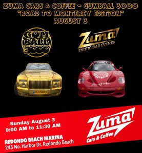 At Redondo Beach Marina on the ocean. Exotics, classics, movie cars, unusual cars and others. Public welcome.